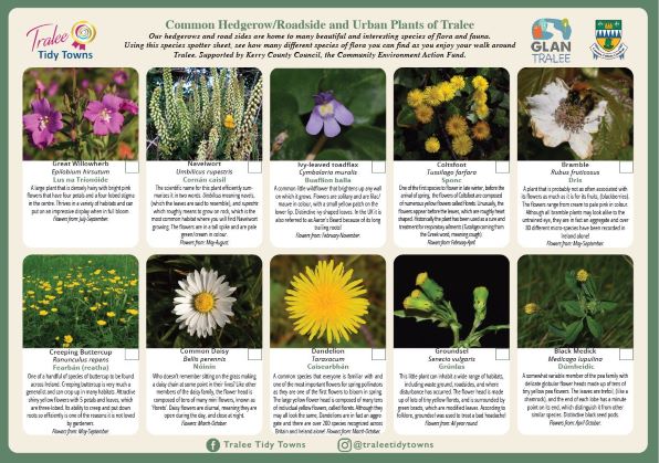 With the support of the Kerry County Council Biodiversity Officer and Munster Technological University, we funded the creation of a species spotter sheet to build awareness of our urban wildflower species. These sheets have been used in our wildflower walks, by local schools and visitors to the town and we hope they will develop interest in species identification and recording.
